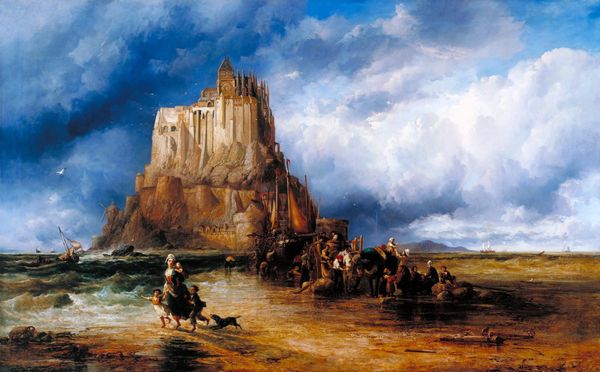 Curator: My first impression is that this is a place of almost Biblical drama, a space of encounter and reckoning. Editor: Indeed. What we have here is Thomas Moran's "Cliffs of the Upper Colorado River, Wyoming Territory." Though undated, it exemplifies Moran's Romantic vision of the American West. Curator: The rain cascading down in sheets really sets a stage for something epic. Is it judgment? Renewal? And then you see figures, small but present. Who are they, and what are they facing here? Editor: Symbolically, water often represents purification or cleansing, but also the force of nature—unpredictable and sometimes destructive. Notice the figures on horseback, likely Indigenous peoples, placed against the monumental landscape. Their presence, their connection with the land, has become a focal point within current discourse of landscape art. Curator: Absolutely. I see how Moran’s rendering elevates and simultaneously diminishes. The sheer scale of the natural world almost swallows these human figures. It speaks volumes about the prevailing power dynamics. How are we to read these images today, aware as we are of their historical baggage in promoting manifest destiny and westward expansion? Editor: We see the same dynamic within other pieces produced in the Hudson River School, in which light acts as a beacon—a call to expansion. Moran masterfully utilizes the dramatic chiaroscuro of light and shadow, a Romantic hallmark that conveys both grandeur and the sublime terror of nature. Curator: The Hudson River School aesthetic itself served a colonial project, portraying the landscape as both powerful and ripe for taking. Are we then to find in this painting simply a symbol for nature or for erasure, a representation of power or for dispossession? Editor: These landscapes provided visual justification for that colonial impulse. Curator: So, in contemplating "Cliffs of the Upper Colorado River, Wyoming Territory" today, it prompts essential reflections on the artistic legacies we've inherited. Editor: By unveiling and examining these latent, often painful, narratives, we create a space for open, continuous dialogue.