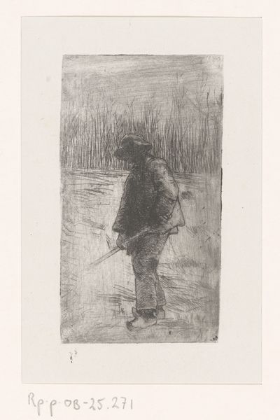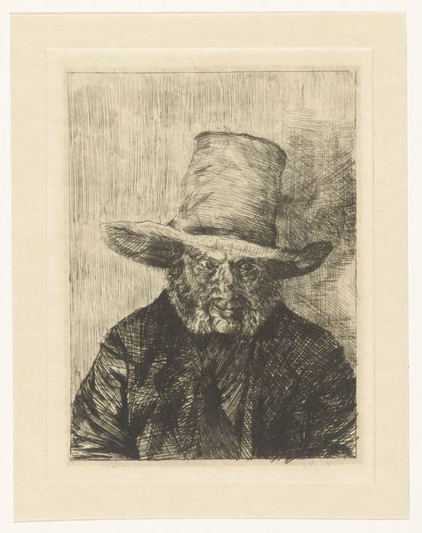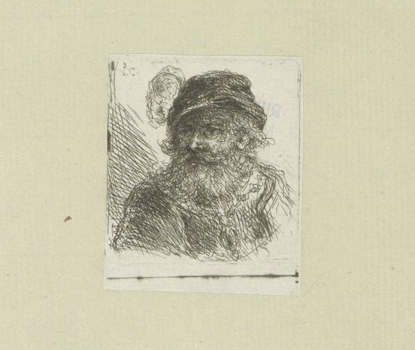 This is a small etching, only about 5 centimeters high, of an old man in a wide-brimmed hat, printed anonymously, and now held at the Rijksmuseum. During this period, representations of older men often carried the weight of societal expectations and stereotypes. The lines etched here highlight the man's weathered face and suggest a life marked by hardship. His hat, pulled low, casts a shadow that obscures his eyes, lending him an air of mystery and introspection. Prints like these allow us to reflect on the lives of ordinary people, and the narratives of age and experience. What stories do you think his expression tells? Does it maintain traditional representations, or does it offer alternative narratives? Ultimately, this etching invites us to contemplate the complexities of aging, memory, and the human condition. It serves as a reminder of the importance of recognizing the value and dignity of every individual, regardless of their place in society.