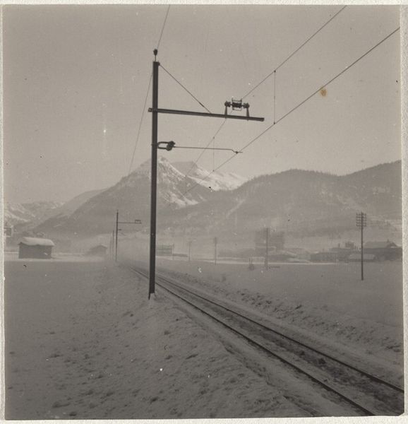 Editor: Here we have Robert Frank’s “Train Tracks—Transportation,” a gelatin silver print from the early 1940s. The landscape is stark, mostly snow. It has such a bleak mood to it. What captures your attention most in this piece? Curator: The bleakness, as you say, is precisely what resonates. Look at the materiality of the gelatin silver print itself. This wasn’t mass-produced, digitally altered, or immediately available. The physical act of creating this image, developing it in a darkroom, represents labor. Consider the context: the early 1940s, during wartime. Resources were scarce, and the railways, often vital for wartime supply chains, here appear quiet and inactive. Editor: So, it’s about the implications of both making the photograph and what it represents? The lack of action is almost louder than any visual object. Curator: Precisely! Think about the social context surrounding transportation then. Railways moved goods and people, contributing directly to economies both thriving and failing in wartimes. But also, how were photographs circulated in this moment? As propaganda or historical record? Editor: The scarcity in this print compared to images overflowing the internet is striking. Now that I think about it, seeing “transportation” in such a barren form is thought-provoking given how obsessed we are with speed and getting places. Curator: Exactly. The value, not in speed or movement, but of labour behind both the industrial and artistic endeavor, isn't always readily visible but completely transforms how one may interact and understand the scene and its setting. Editor: I never considered photography in light of industrial processes, it’s insightful to think of even artistic material through its context of production and circulation. Thank you. Curator: And I am challenged to reconsider how images carry traces of the time that the photograph comes from. Thank you.