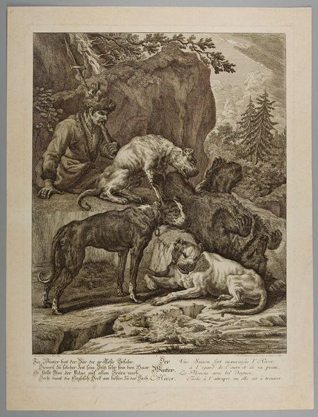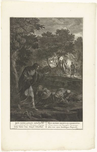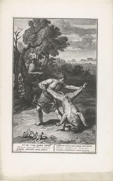 Joseph Mulder created this engraving, Straf van de ongehoorzame godsman, or Punishment of the disobedient man of God, around the turn of the 18th century in the Netherlands. The print depicts a biblical scene about the consequences of disobeying God's direct orders. We see the disobedient prophet lying prone on the ground having been mauled by a lion. His ass stands nearby. In the background, another man gestures in horror, seemingly the only witness to this divine retribution. During the Dutch Golden Age, prints like this were common. They reflected a culture deeply influenced by Calvinist Protestantism and its emphasis on personal piety and adherence to religious law. The visual language used here – the dramatic landscape, the expressive figures – is rooted in Baroque art, which was widely used to convey moral and religious lessons. Understanding this engraving requires delving into the religious and social context of the time, including the role of the church, the rise of print culture, and the function of art in shaping moral behavior. These prints were not merely aesthetic objects; they were powerful tools of religious instruction.