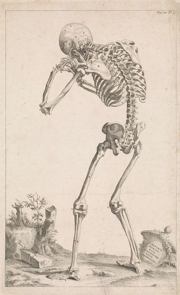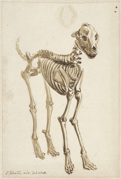 This is Christian Hallbaur's engraving "Skeleton of a Fox," made sometime in the 18th century. Hallbaur, working in an era of scientific exploration and classification, presents us with more than just a zoological study. The fox, an animal often marginalized and vilified in folklore and rural life, is here rendered with careful detail. The print presents the fox with a degree of dignity, inviting a reconsideration of its place in the natural – and social – order. Consider the emotional weight of such precise rendering. Are we meant to empathize with the fox, to see beyond the stereotypes, or is this merely an exercise in detached observation? What does it mean to strip bare the structures that support a living being, and how does that change our perception of it? Ultimately, Hallbaur's work invites us to contemplate the boundaries between the observer and the observed, the known and the unknown.