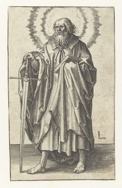 Editor: So this is Martin Schongauer's "Apostle James the Greater," an engraving from around 1470 to 1491. The figure is rendered in incredibly fine lines. What stands out to me is this combination of serenity and weariness in the face. How do you interpret this work, considering its time and context? Curator: It’s crucial to view this image through the lens of its historical moment. The late 15th century was a time of massive social upheaval and religious reform, preceding the Reformation. The print's emphasis on James’s humility and his status as a pilgrim subtly critiques the Church's power. James, often depicted as a strong warrior, is shown here with bare feet, a walking stick, embodying the everyday person, the disenfranchised. How does the contrast between James's staff, a symbol of authority, and his bare feet challenge traditional iconography? Editor: I see what you mean. His bare feet certainly challenge traditional depictions of saints as powerful figures. They bring him down to earth, connecting him with the common person and his potential audience. The intended audience? Were they among the elite or everyday people? Curator: Considering that prints could be more easily and widely distributed than paintings at this time, and in the context of a growing literacy, the artwork democratizes religious imagery, giving the commoners visual access and empowering them to reflect and form individual interpretations of the Bible. This potentially empowers the viewer to have a personal connection with their faith, instead of blindly following the Church. Does it resonate with contemporary ideas of religious or political empowerment? Editor: That’s a really powerful point. Seeing it as a tool for potential empowerment reframes the entire image for me. Thanks! Curator: My pleasure. Seeing art through the lens of social dynamics can be incredibly insightful, especially when considering how images affect society, historically and now.