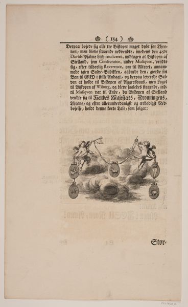 This is an engraving by Odvardt Helmoldt de Lode, made in Denmark around 1750. The print depicts a vignette made for the coronation of King Frederick IV. A royal crown sits above an ornate frame, flanked by cherubs. The text accompanying the vignette describes the rituals of the coronation, in which bishops bowed before the king and queen. In this period, the Danish monarchy was absolute, with the king holding supreme power sanctioned by God. The coronation ceremony was a key institution in the construction of royal authority. By the mid-18th century, however, this model was beginning to be challenged by Enlightenment ideas about popular sovereignty and the rights of man. Historians of political culture use such visual and textual sources to understand the changing social and political landscape.