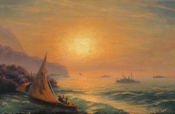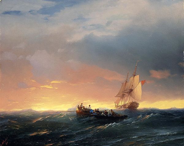 Editor: Asher Brown Durand's "The Stranded Ship," painted in 1844, really evokes a sense of loss, doesn’t it? All that wreckage on the shore… It's like a maritime still life made of broken dreams. What do you see in it? Curator: It’s crucial to consider Durand's landscape painting through a materialist lens. Look at the broken barrels and planks on the shore – they speak of global trade, the exploitation of natural resources, and the labor required to build and sail such a vessel. The 'still life,' as you say, represents the wreckage of capitalist ventures and its very real human costs. What survives the shipwreck? The commodities, repurposed as refuse. Editor: I hadn't thought about it that way, I was just reacting to the drama of the scene. But those discarded objects… so you are saying the material reality becomes the subject? Curator: Precisely! Durand gives us romanticism grounded in material reality. The means of production are highlighted by their absence, represented through what they leave behind. Consider the cost of the ship’s construction – the trees felled, the labor exploited, the resources consumed. Can one truly celebrate the aesthetic of this artwork without acknowledging the inherent costs involved? Editor: So it's not just about the beautiful sunset, but also about what's left behind when things go wrong. That changes my whole perspective. Curator: Indeed. Think of the pigments themselves, the canvas – each component tied to a global network of extraction and trade. A materialist perspective compels us to acknowledge those histories, enriching our understanding of both the art and the society that produced it. Editor: Wow, I am not sure if I would have caught that! I will certainly think differently when I approach this type of artwork now. Curator: The beauty is in seeing, thinking, and being transformed.