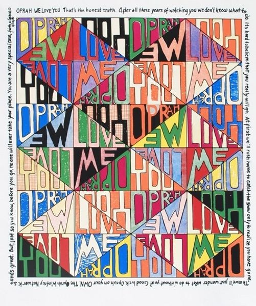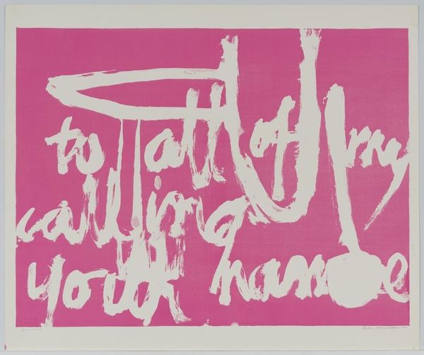Editor: Here we have Corita Kent's screen print, "the sure one." The bold typography and vibrant colors feel so graphic and energetic. What story do you think the materials and process tell here? Curator: Considering Kent’s background in printmaking and activism, her use of serigraphy, a process allowing for mass production and dissemination, democratizes art. The bright, almost jarring colors, typical of commercial advertising, are subverted, forcing us to consider the means and message of production. How does this clash of high art and commercial technique challenge traditional notions of art and labor? Editor: It definitely makes you think about how art is made and who it's for! I hadn't considered the connection between her activism and her artistic choices so directly. Curator: Exactly. The choice of materials and techniques were very deliberate to reach as wide an audience as possible. Understanding her process helps us decode the message.