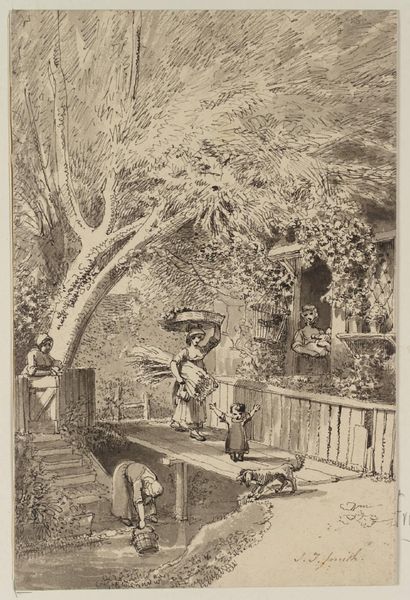 Editor: This is "The Chase House," an etching by Childe Hassam from 1929. I am struck by its almost ghostly quality, all these intricate lines capturing a building and figures with such delicate detail. What draws your eye when you look at this print? Curator: Well, immediately I’m transported back, aren't you? I see a scene steeped in a bygone era, rendered with such intimacy. It reminds me of those quiet afternoons where sunlight filters through leaves, creating dappled patterns everywhere. It's more than just a cityscape; it’s a feeling. Look at how Hassam used line work to create depth; it’s like he’s whispering stories with every stroke. Don't you feel drawn into their little world for just a brief moment? Editor: Yes! The density of the lines, especially around the tree and building, creates this amazing contrast with the open space of the street. It gives a real sense of atmosphere. The tree seems almost to be a part of the building. Curator: Exactly! That merging, that’s what makes it magical. Think about the precision of an etching—each line meticulously placed. But beyond the technical skill, consider the choice of subject matter. It’s everyday life, elevated. Almost like he's saying: here, see the beauty in the mundane. And what about the figures? What are they thinking? Where are they going? Are you inspired by them at all? Editor: I think they bring an element of life to what might otherwise be a static scene. They are heading towards a new beginning, perhaps? It's subtle but profound, don't you think? Curator: Profound indeed! Art, isn't it fantastic? It speaks without uttering a word, revealing more each time you look, stirring your imagination, allowing you to step into history. Editor: Absolutely. It really makes you appreciate how much a single image can capture and convey. I'll definitely think of Hassam’s etching differently now!