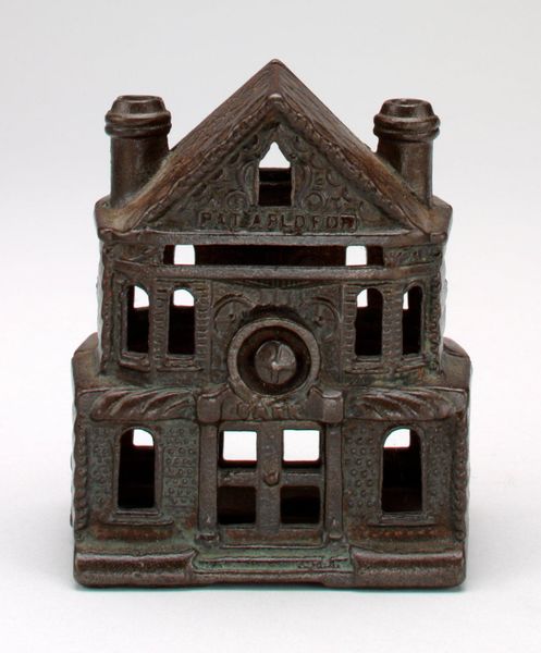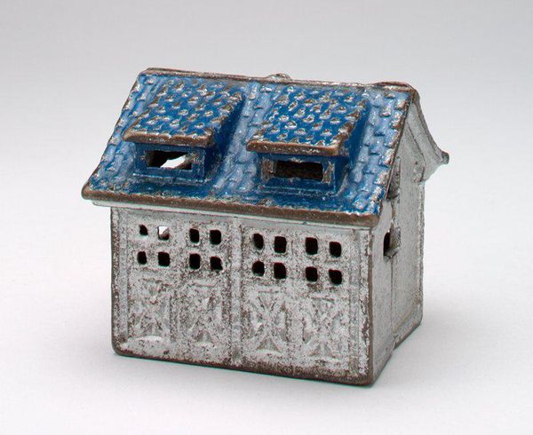 This cast iron still bank, in the shape of a one-story house, was manufactured by the Kenton Hardware Manufacturing Company, sometime between 1890 and 1950. You can see how the form is a direct expression of its industrial origins. Molten iron would have been poured into a mold, allowed to cool, and then removed. The seams of the mold are still visible. The repetitive patterns of the roof tiles and windows were easily achieved through this process of serial production, which also hints at the social context of this work – mass-produced objects made for the mass market, as affordable commodities. The final result has a satisfying heft, and a tactile, slightly rough surface that speaks to the nature of the material. The color, a warm reddish-brown, is also inherent to the iron. Recognizing this bank as more than just a functional object or a nostalgic toy allows us to appreciate the skill and design that went into its making, blurring the lines between craft, design, and industry.