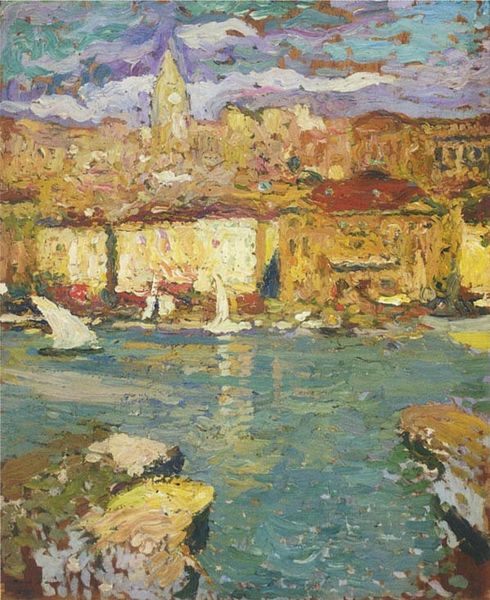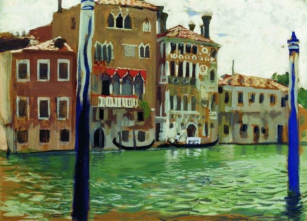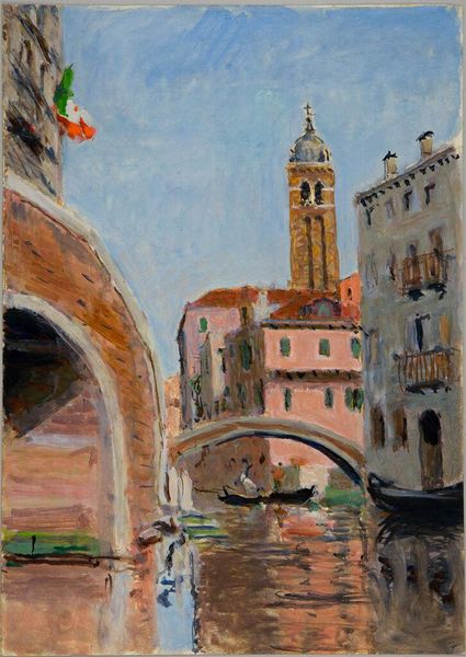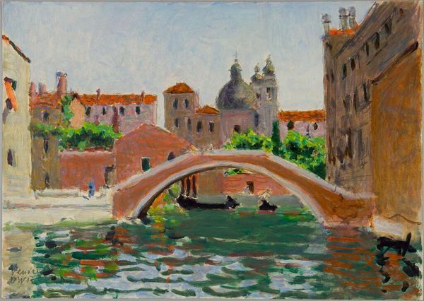 Curator: Here we have Denman Waldo Ross's "Canal Scene," part of the Harvard Art Museums collection, capturing a waterside view at about 9 by 14 inches. Editor: The buildings almost seem to melt into the water with such immediacy. There's something elemental about it, a primal energy in the paint application itself. Curator: Ross simplifies the architecture into shapes and color blocks, like a child's building set, a symbol of urban growth and decay, mirrored in the canal. Editor: The boats, too, become like symbols of human presence. I see hints of Venetian flags, perhaps? Bright sails, echoing celebration but also a sense of trade and coming and going. Curator: There’s such an energetic quality in the water. The reflections of the buildings seem to dance and flicker, creating a sense of movement and change. Editor: The palette has an earthy quality, doesn't it? Reminds me of frescoes. It’s as if Ross is trying to capture something timeless, the essence of a place beyond a fleeting moment. Curator: I get the sense that Ross invites us to see the world through a more innocent, unjaded lens, the way you see things anew each day. Editor: Indeed, the painting serves as a reminder of Venice's historical and cultural depth, with the buildings acting as symbols of resilience. It's a lovely dialogue between place and memory.