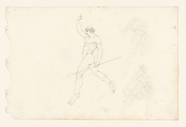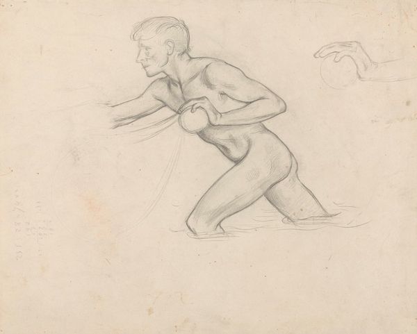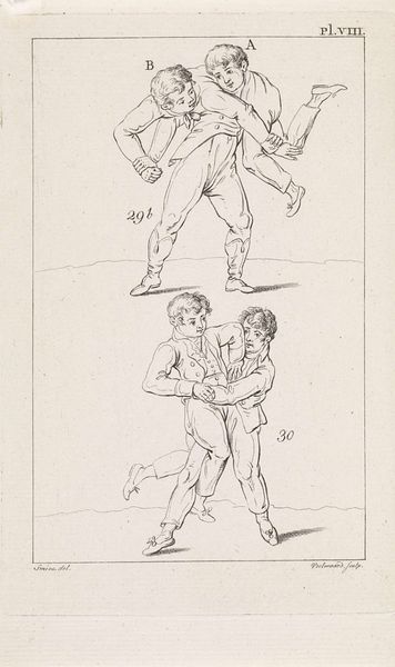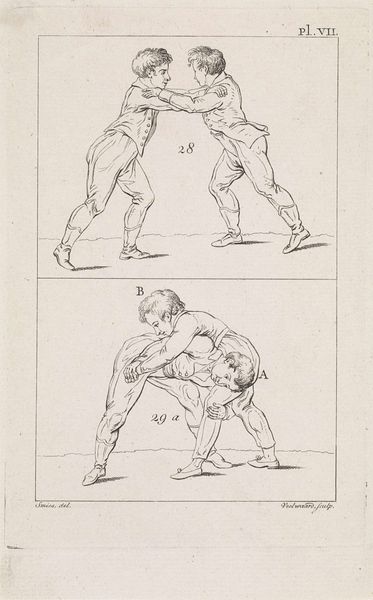Peter Paul Rubens created this line drawing of nude figures with ink on paper. The composition is divided into two distinct registers. The upper register features two figures in what appears to be a gesture of offering or confrontation. In the lower register, two figures are locked in a dynamic wrestling match. Rubens masterfully uses line to define form and convey movement. The stark contrast of the ink against the paper emphasizes the muscularity and tension in the figures' bodies. Note how the lines aren't just outlines; they vary in thickness and intensity to suggest depth and volume, creating a sense of three-dimensionality on a flat surface. The arrangement of the figures invites a semiotic reading; the juxtaposition of potential connection versus physical struggle could symbolize the dual nature of human interaction, reflecting broader philosophical concerns about conflict and harmony. The careful rendering of anatomy, combined with the dynamic composition, shows Rubens' interest in human form and narrative.