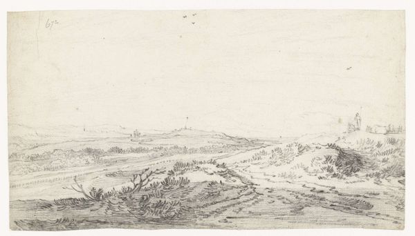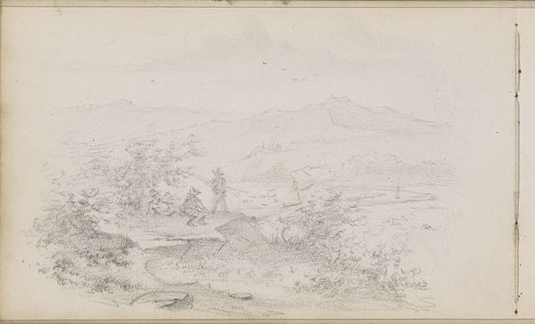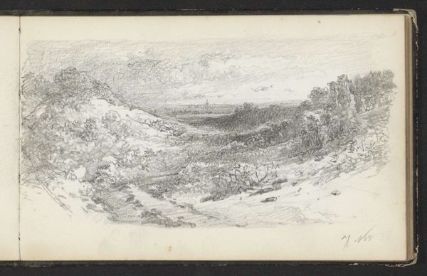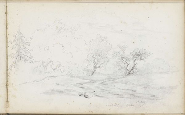 Curator: Here we have a drawing by Andreas Schelfhout, titled "Heuvellandschap met bomen en struiken," or "Hills with trees and shrubs," created around 1811. It’s rendered in pencil, a quick study perhaps. Editor: There's an understated charm, almost fragile, to this sketch. A kind of romantic longing permeates it, don’t you think? It has a muted intimacy, as if we're eavesdropping on a private moment. Curator: It is a beautifully observed landscape. We have to consider the historical moment though; early 19th-century landscape art was emerging as a significant expression of national identity and Romantic ideals. Schelfhout was working within a very specific tradition. Editor: And landscape in the early 19th century reflected much of the Romantic era ideals, even national anxieties. Was this pristine natural world under threat? Is the lightness of touch indicative of fragility, or an assertion of resilience in a landscape, post-Enlightenment? Curator: Precisely! Also, while the technique appears simple, its cultural importance as both national and artistic territory is key here, and connects him to the later Hague School. Artists were grappling with how to represent the landscape, what to foreground and omit, and crucially for whom. This image can also be interpreted through lens of colonialism, what were its links to concepts of ownership and extraction? Editor: Good points. It invites us to contemplate the loaded relationship between human representation, natural resources and the ownership, but does that initial simplicity and romantic notion, help to cover the underlying ideology of natural dominance, where it serves a predominantly male, and potentially exploitative gaze? I read a real tension into that choice of perspective, the lightness is almost subversive. Curator: And that subversive lightness makes this seemingly simple study a fertile ground for socio-political readings of both his artistic practice, and how notions of national identity, or the dominant class and gender within it, become projected through seemingly bucolic scenes. Thank you. Editor: It highlights so clearly that these idyllic landscapes weren’t just about aesthetic beauty but very much loaded political constructs.