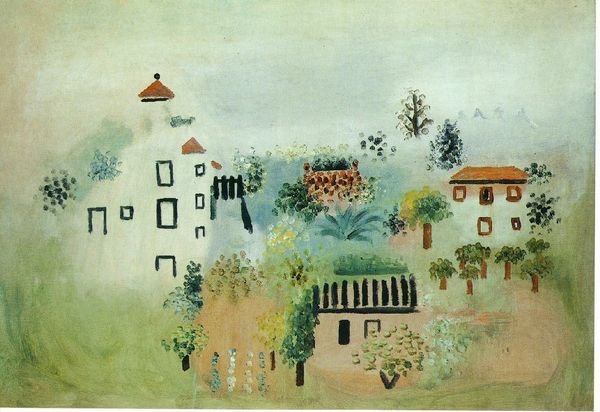 Editor: We're looking at Robert Falk’s "Yard in Crimea," painted in 1916. It’s an oil painting, full of impasto texture. I’m immediately struck by the way the buildings seem both solid and slightly…unreal. The colours are earthy, but the composition feels almost dreamlike. What stands out to you? Curator: That’s a delicious observation! You’re right, there's a palpable tension. Falk, amidst the tumultuous Russian Avant-Garde, wasn't interested in mere representation. Instead, the artist embraced subjective experience. For instance, how does the roughness of the impasto contrast with your ideas of what a vacation is supposed to feel like? Editor: It's kind of jarring! You expect a relaxed, sunny vibe, but the texture feels almost…anxious. Maybe reflecting the pre-revolution unrest? Curator: Exactly! Falk plays with these tensions. The solidity of the buildings offers comfort, but the broken brushstrokes hints at instability. There's almost a Fauvist-like use of color that expresses a subjective mood, and the composition offers some of the flattened perspective often found in Cubism, both radical ideas during that time period.. It is both present and ephemeral, serene and slightly unsettling. What would you say Falk is trying to reveal about life here? Editor: I guess it is a glimpse of a specific moment, both beautiful and precarious. A place caught between tradition and change, like the avant-garde itself, perhaps? Curator: Beautifully said. And like any true poem, this painting speaks volumes about its time while retaining its capacity to surprise us. What I find most compelling is how relevant these complex tensions still feel today.
