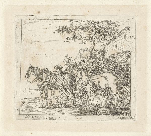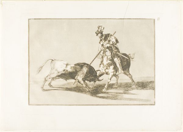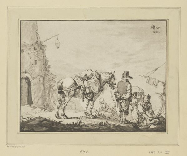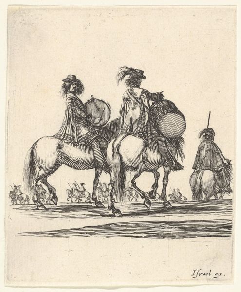 Lorenz Frølich created this diminutive etching, "Et møde," using delicate lines to depict a chance encounter. The composition, though small, brims with dynamism. Observe how Frølich uses line to construct form. Through the etching technique, each contour is built with a series of marks, not unlike language itself. He is employing a semiotic structure, where the density and direction of lines function as signs, communicating volume, movement, and texture. Notice the contrast between the sharply defined figures in the foreground and the sketchier, more ambiguous background. This contrast isn't just representational, but structural. The etching invites us to consider the role of encounters—how chance meetings can momentarily disrupt and reconfigure social space. It is a fleeting moment, captured through a web of lines, implying that meanings are not fixed but constructed through relations.