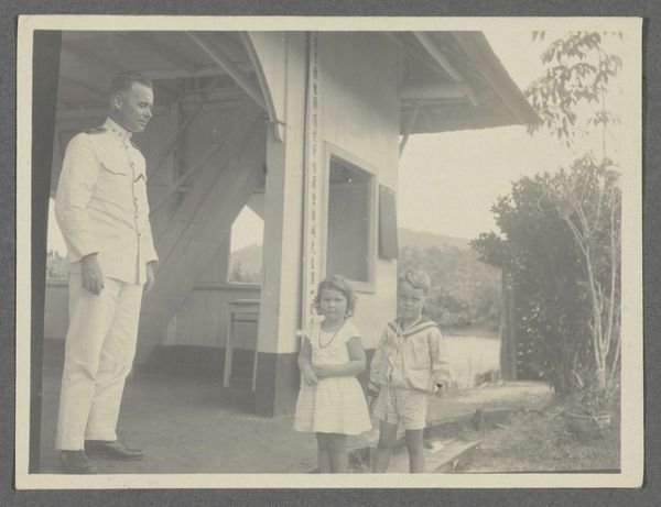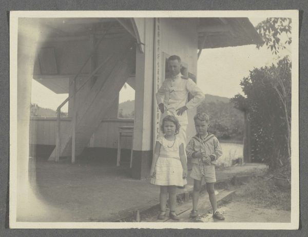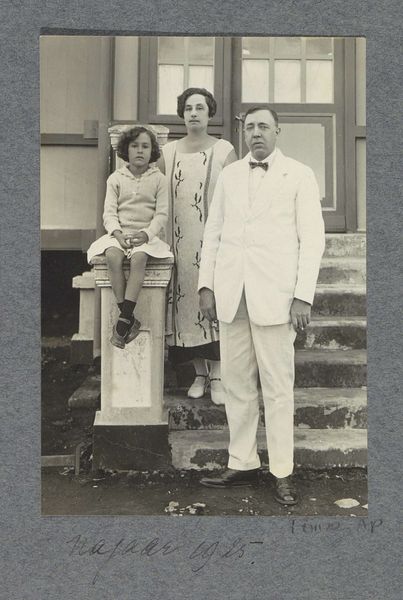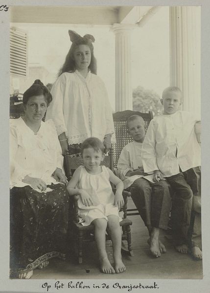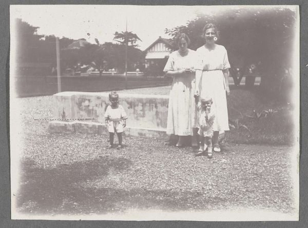 Editor: We're looking at a photograph titled "De familie Brouwers op plantage Accaribo," taken in 1922. It's currently held at the Rijksmuseum. It strikes me as quite a formal portrait. What catches your eye in this composition? Curator: Formally, observe the tonal range: a spectrum of grey from the off-white garments of the family to the darker greens of the foliage. The almost symmetrical arrangement, with the umbrella acting as a central axis, creates a sense of balanced stasis. Note the repetition of patterned textiles, and how those contrast to the plain garments worn by the elders in the image. The rigid positioning of the subjects seems deliberate. Editor: Do you think the way they're standing contributes to the photo's message? Curator: Consider the formal aspects first. The rigidity certainly underscores a sense of...control, perhaps? Note also the subtle but deliberate arrangement of bodies, each occupying a precise point in the visual plane, which generates a spatial equilibrium that reflects something more than simple likeness. The interplay between light and shadow provides the photograph with its depth and its visual narrative. Does the symmetry resonate with you, or does it seem too posed? Editor: I hadn't noticed the subtle symmetry before, but it does lend the photo a certain authority. Thank you for highlighting the composition's structural elements. I learned a lot from that perspective. Curator: And I in turn value your attention to historical nuance; food for further formal analysis.