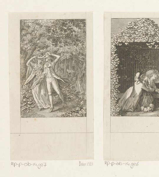 Editor: This is "Figaro zit verdrietig in de tuin," or "Figaro sitting sadly in the garden," a print from 1785 by Daniel Nikolaus Chodowiecki, held at the Rijksmuseum. It feels…melancholy. The lone figure is very isolated in a detailed but somber landscape. What can you tell me about this work? Curator: It’s interesting that you perceive melancholy, as that ties into the political undercurrent of the time. Chodowiecki made this work during a period of social and political upheaval. How do you think the French Revolution, brewing at the time, may have impacted how audiences perceived imagery of sadness or social isolation? Editor: That’s a great point. Perhaps it reflected a general unease with the established order, even for someone seemingly as privileged as Figaro, if we associate the character with the opera. But does the style contribute to that unease? The baroque elements feel almost anachronistic. Curator: Exactly. The use of an older style can be read as commentary. Consider the institutional role of art at the time. Was Chodowiecki perhaps critiquing the established art world’s preference for certain styles and subjects, implicitly drawing parallels to other forms of societal structures resistant to change? What statement could he be making about the elite? Editor: So, by depicting Figaro in this way, was Chodowiecki maybe giving a voice to the growing discontent amongst those feeling left out, connecting with the audience beyond just the aristocracy? Curator: Precisely! The power of images lies not just in what they show but also how they resonate within the specific political and cultural contexts they were created. Editor: That's fascinating! I'd only focused on the immediate emotion, but seeing how socio-political forces are at play has really opened my eyes. Curator: Understanding that connection is the key to really unlock a work of art's message, how imagery shapes our social understanding, and how public art, in turn, is also molded.