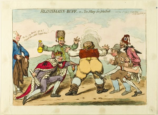 Editor: We’re looking at Thomas Rowlandson’s "Plump to the Devil We Boldly Kick'd Both Nap and His Partner Joe." It’s a riot of figures being kicked into what appears to be hell! What’s the story here? Curator: This print, likely from the early 19th century, uses caricature to express British political sentiment. Consider the title – "Nap" probably refers to Napoleon Bonaparte. How does the visual language contribute to this political message? Editor: It’s definitely not flattering. The figures seem exaggerated, almost grotesque. Is this typical of the time? Curator: Precisely! Rowlandson employed satire to shape public opinion. The grotesque figures demonize Napoleon and his allies, playing on nationalistic fervor and anxieties about French power. What does this tell us about the role of art in shaping political discourse? Editor: It shows how art can be a powerful tool for propaganda. I never thought about cartoons that way! Curator: Exactly. By understanding the historical and cultural context, we see how art actively participates in shaping the political landscape.