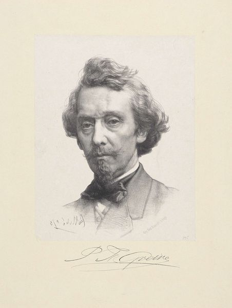 Curator: Welcome. Here we see a painting simply titled "Petrus Franciscus Greive (1811-72), Painter," dating roughly between 1870 and 1895. Editor: Immediately, the restrained palette strikes me. Browns and blacks dominate, yet the face retains a luminosity. One immediately wonders about the circumstances of its creation, no? Curator: Indeed. The artist's use of chiaroscuro is significant. Observe how the light models the subject's face, drawing our attention to his expression. The tight, almost claustrophobic oval frame further focuses our gaze. Editor: That oval and those earth tones! I want to know the history of that pigment. Were they local materials, impacting artistic choices? Was this destined for someone specific or created for a specific audience? Also, there’s a stark contrast between the artist's carefully rendered face and the almost rushed quality of his attire. Curator: I concur, the contrast is noteworthy. Could it represent the artist's internal world versus his public persona? Or is the rough execution of attire and surrounding background a method to prioritize the gaze and emotion that's coming through his eyes? Editor: Perhaps. Though let's not disregard the societal constraints affecting artistic labor. How readily available were materials, studio space, and patronage? This affects everything, even portraits like these, no matter how “internal” the artist tries to depict them. Curator: Granted, materiality influences production. Yet, the subtle gradations of tone, especially in rendering of light on his cheek, nose and brow reveal a dedication to mimetic precision beyond mere economic necessity. It invites a deep psychological reading. Editor: Precisely. His psychological intent can only be so effective while painting under social constraints and making sure there are economic and social ties strong enough to provide a setting for his artwork. Curator: Fair. It’s the convergence of intention and context. Editor: Exactly. It makes me reconsider everything from the scale to those colors. Curator: Ultimately, its power resides in this tension between aesthetic mastery and historical embeddedness. Editor: A captivating tension that enriches the encounter.