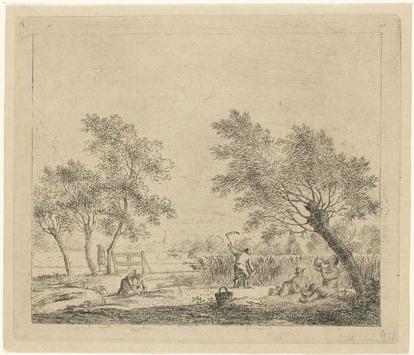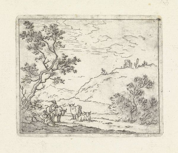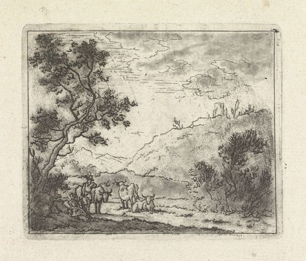 Johannes Janson created this landscape with rider using etching techniques sometime in the 18th century. This seemingly innocuous pastoral scene offers a glimpse into the complex social hierarchy of the time, reflecting the privileges and power dynamics inherent in the Dutch Golden Age. Consider the figures depicted: a man on horseback points into the distance, while two men on foot follow with hunting dogs. Who has access to leisure, mobility, and authority? The man on horseback clearly belongs to the ruling class. The working class is represented by the men on foot. Think about the ways in which landscapes often served as stages for performances of class and dominance. Janson invites us to reflect on the social structures that shape our interactions with the natural world, as well as the subtle ways in which power is inscribed within seemingly idyllic scenes.