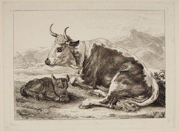 Curator: Here we have George Hemming Mason's watercolor piece, Roman Ox (Lying down). Its realistic style immediately brings to mind rural landscapes. Editor: It evokes such stillness, doesn't it? The subdued color palette, predominantly earth tones, really underscores that sense of repose. The ox itself fills the frame, commanding attention even in its languid state. Curator: Indeed. Throughout history, oxen have represented various things, power, patience, servitude...Here, the artist presents it with a quiet dignity, almost contemplative. Perhaps alluding to a simpler, agrarian past. Editor: I'm intrigued by how the light defines its form, almost sculpting its mass from shadow. Note the textural brushwork. You can almost feel the coarse hair and the weight of its body pressing into the earth. There’s also a clear division of space - the figure dominates the ground on which he lies, and it contrasts the emptiness of the background behind him. Curator: And its presence extends beyond the purely aesthetic, suggesting a connection to deeper mythological roots. The image of cattle harkens back to early Mediterranean civilisations and pagan symbolism, invoking a pastoral calm we rarely afford ourselves. Editor: Absolutely. It's as if the artist sought to capture a timeless essence of rural existence. The ox, as a cultural symbol, shifts from its ancient, agricultural origins to embodying enduring human values like diligence and harmony with nature. It feels like Mason wants to suggest something essential about the connection of all humans and their landscapes. Curator: I completely agree, there is a nostalgic element within this work. Through simple presentation, Mason brings our focus to this timeless bond. Editor: What an evocative study, ultimately - a celebration of form, texture, and the powerful resonance of the pastoral. Curator: A subtle and meaningful piece to consider in terms of humanity's ongoing relationship to the animal kingdom.