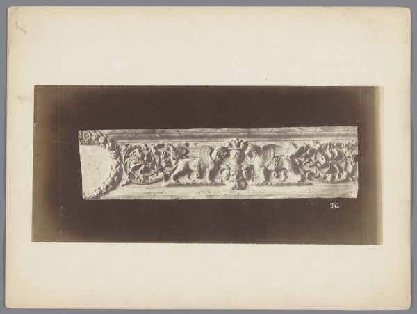 Isidore Kinsbergen created this photograph of the Lalitavistara relief on the main wall of Candi Borobudur between 778 and 824 AD. The photograph captures a series of reliefs with complex, detailed figures and scenes carved into stone, evoking a sense of intricate storytelling and cultural richness. The composition is divided into registers, each containing narratives. The upper relief shows King Suddhodana visited by gods, while the lower one depicts an offering scene at a temple. Kinsbergen uses light and shadow to accentuate the depth and texture of the carvings. Each figure and architectural element is meticulously rendered, revealing a sophisticated understanding of space and form. The reliefs function as visual texts, conveying religious and cultural narratives. They are not merely decorative but serve as didactic tools, illustrating Buddhist principles and stories. The photograph preserves these reliefs, allowing us to decode their visual language and engage with the philosophical underpinnings of this cultural heritage. It reminds us that art invites ongoing interpretation, deepening our appreciation of human creativity and thought.
