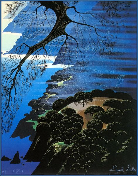 Eyvind Earle made this serene landscape, "Mystical Fog," using gouache, likely sometime in the mid to late 20th century. Earle’s landscapes often evoke a sense of idealized natural beauty. His style is characterized by clean lines, simplified forms, and a distinctive color palette. "Mystical Fog" is a study in atmospheric perspective. It is a romantic vision of nature, untouched by industry and the pressures of modern life, which gained traction after the Second World War. To further understand his works we can look into the artist’s biography and exhibition history. His time working as a background artist for Disney Studios may have influenced his ability to create fantastical and immersive environments, like the one seen here. The study and preservation of such works are of great value to our cultural institutions.