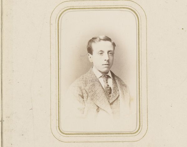 Curator: Let's consider this arresting portrait from between 1858 and 1890. It's an albumen silver print by A. Bõeseken titled, "Portret van een man met snor, baard en vlinderstrik"—or in English, "Portrait of a man with mustache, beard, and bow tie." What are your immediate thoughts? Editor: There’s something stark and rather poignant about this image. The limited tonal range gives it a muted feeling. Curator: Indeed, the very nature of early photographic processes plays a crucial role here. Looking at the man's dress, it firmly situates him in a rapidly changing social landscape. Who had access to photographic portraits and how might we understand that now? Editor: Good question. We're talking about gelatin silver prints here. These prints were integral to the mass dissemination of imagery, a point when photography transitioned from specialist endeavor to more widespread commercial activity. He likely came from a specific social bracket and perhaps it gave access to enhanced power dynamics. Curator: Absolutely, the photographic portrait itself became a powerful tool for self-representation within specific societal strata. Gender norms also come into play. The subject is posing with decorum to embody the bourgeoise ideology. Editor: And consider the economic realities—the rise of photography studios created work. We're talking labor, craft. This simple image reflects a very tangible shift in production. Curator: Precisely, analyzing photography provides insight on evolving technological means as well as historical power relations. Photography captures the shifting role of gender roles during a particular moment in time. It serves as a window into a vanished world, urging a dialogue on representation, agency, and the means by which we create and interpret individual identity within societal shifts. Editor: Indeed, a photo that seems so simple really prompts you to consider just how it got made, how many people it impacted directly and indirectly. That alone is pretty special. Curator: And ultimately, how we can learn more about who had the power of visibility and representation in those historical moments.