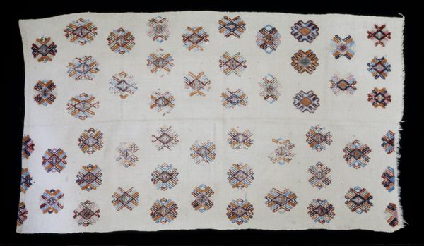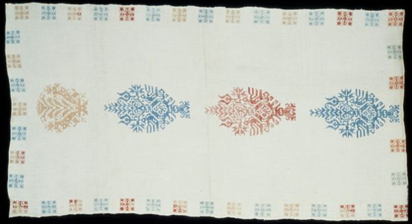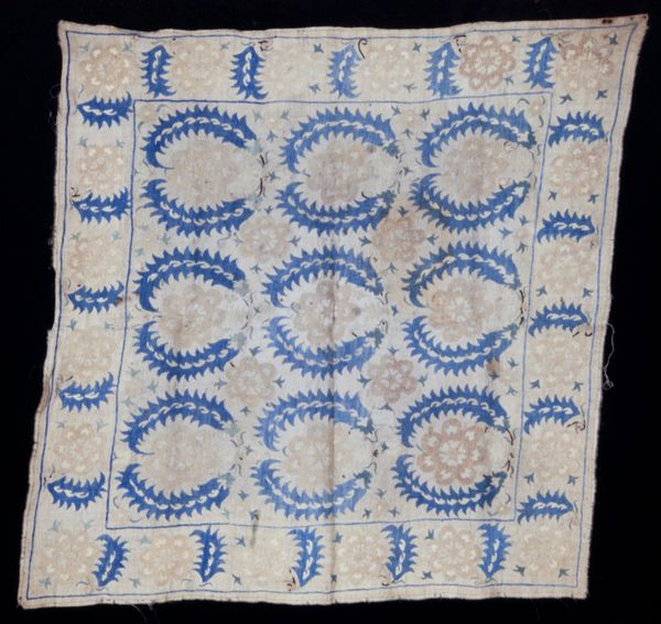 Editor: So, here we have "Part of a Bed Hanging," a textile weaving from the 19th century. The repeated floral patterns are quite striking, giving it a sort of peaceful, folksy feel. What do you see in this piece? Curator: I see a powerful assertion of cultural identity expressed through the domestic arts. Textiles, especially those made by women in the 19th century, weren't just decorative; they were a space for expressing personal and communal narratives when other avenues were blocked. Editor: Communal narratives? In a bed hanging? How so? Curator: Consider the time and labor involved. This likely represents a collective effort, passed down through generations. The repetition of patterns, the hand-embroidered details – it all speaks to shared traditions and a defiance of imposed cultural norms through a subtle assertion of local aesthetics and skills. Who gets to decide what is 'art' and what is merely 'craft'? Editor: That’s a really interesting point. It does make me rethink my initial assessment. So, it’s less about folksy peace and more about…resistance? Curator: Perhaps resistance woven into the fabric of daily life. The bed hanging, a private space, becomes a canvas for a quiet, persistent voice. Do you see any elements that you recognize from other works of textile art? Editor: Now that you mention it, I'm reminded of some quilt-making traditions and coded messages in textiles... Curator: Exactly! These domestic textiles often served as forms of communication, particularly within marginalized communities. Editor: Wow, I will definitely look at textiles differently now! Thanks for sharing that perspective. Curator: My pleasure. Always consider the narratives hidden within the stitches.