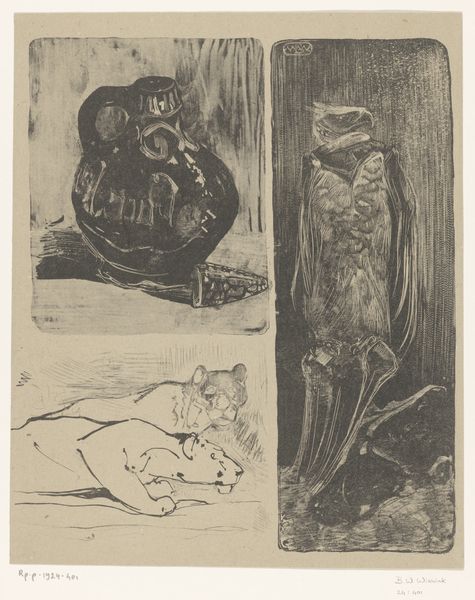 Editor: This is Paul-Albert Besnard's "On the Lookout," made in 1900, using pen and ink. There's something hauntingly romantic about it, the Grim Reaper almost observing a tender embrace. What jumps out at you when you see this piece? Curator: The potency of the Grim Reaper figure is heightened here, isn't it? Not as a violent aggressor but a watchful, almost mournful presence. Consider how cultures represent death; what common symbols do they use and how does this image both uphold and subvert those traditions? Is Besnard critiquing or normalizing our relationship with mortality by having this seated couple above? Editor: That's a really interesting point, contrasting the observer versus aggressor interpretation. So, the couple then becomes less about romance, and more about acceptance, perhaps? Curator: Potentially. Symbolism is multifaceted, layering meaning. Notice the skeletal form of Death is meticulously rendered, a detailed contrast to the ethereal, almost ghostlike couple. The couple might symbolize a wish, not a reality. How might this stark juxtaposition affect a viewer in 1900, versus how it affects us today? Editor: That makes me consider the prevalence of death imagery during that period, perhaps making the image less shocking and more a contemplation on life's fleeting nature. I'm rethinking my initial reading of it now. Curator: Excellent! Images speak to different cultural and psychological expectations across time. By understanding the symbols of that era, and today, we grasp the piece's enduring, shape-shifting message. Editor: Thank you, I hadn’t considered all those layers of meaning embedded in the symbols themselves. It definitely makes me appreciate the work on a deeper level.