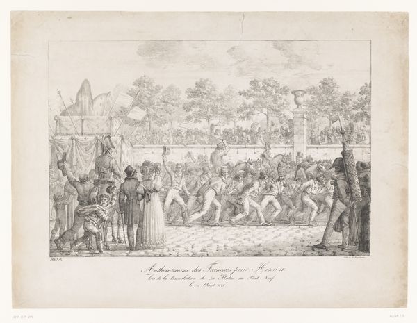 Editor: This is “Dompeldoop bij de Collegianten te Rijnsburg,” a drawing from between 1762 and 1809 by Abraham Pietersz. Hulk, using ink and pencil on paper. The texture created by the detailed lines almost gives it a sense of movement, as if we're catching a fleeting moment. What catches your eye when you look at this piece? Curator: For me, the interest lies in understanding the production of this image. The use of ink and pencil—relatively accessible materials—speaks to a specific mode of dissemination. Was this intended as a preliminary sketch for a larger work? Or was it designed for reproduction and circulation amongst a particular social group, maybe the Collegiants themselves? Editor: That’s interesting. I hadn’t thought about its potential circulation. I was mostly struck by the intimacy of the scene, the close proximity of the figures to the baptism. Curator: Exactly! And the material conditions surrounding religious practice are significant. Were the Collegiants, as a religious minority, deliberately choosing a humble means of visual representation as a reflection of their beliefs? Or was this simply a function of available resources and artistic labor? Editor: So you are saying the drawing’s medium is influenced by the religious Group it represents. And in extension, by the production means within a social structure. Curator: Precisely. Think about the labor involved in creating this detailed scene versus, say, a grand oil painting commissioned by the established church. It invites a deeper consideration of how materiality shapes and reflects social and religious dynamics. Editor: I see it now; thinking about the materials and the production process offers a different lens through which to understand the artwork’s purpose and significance. It gives everyday people a part to play. Curator: And challenges us to reconsider the art historical hierarchy that often privileges certain media over others. Thank you for opening the conversation.