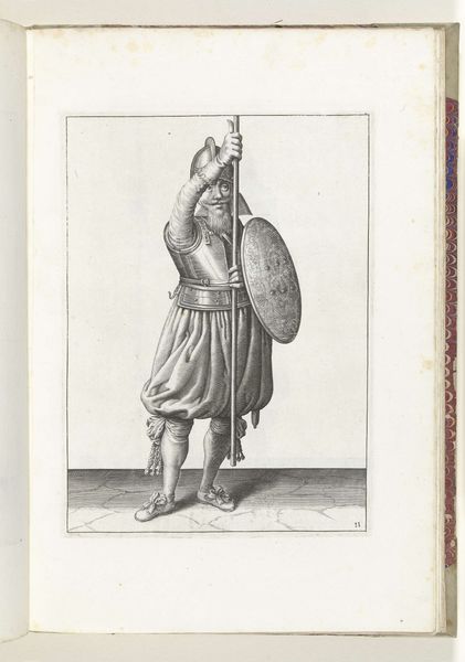 This engraving, made in 1618 by Adam van Breen, meticulously captures a soldier's drill movement. The use of line is dominant, defining the contours of the soldier and his equipment with precision. Notice how the artist uses the line to create a contrast between the soldier's detailed garments and the stark, open space surrounding him, drawing our eye to the figure. The soldier is depicted holding a spear and shield, their circular forms disrupting the verticality of the spear and the soldier's posture. This deliberate composition creates a balance between movement and stillness. The repetitive motion, implied by the title, is arrested in a single frame. The choice of engraving amplifies the graphic qualities of the image, emphasizing form and structure over tonal variation. This reflects a period interest in rational order, capturing an exercise in controlled, precise action. The artwork thus becomes a study in the semiotics of military posture, where each stance and gesture carries meaning within a larger system of martial practice.