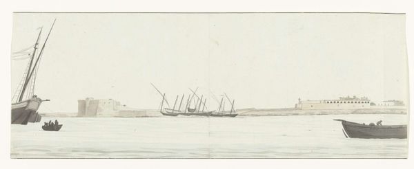 Curator: This delicate sketch, attributed to Willem van de Velde the Elder and believed to date from around 1681 to 1688, captures "The Departure of King Charles II on his voyage along the Thames to Sheerness and Chatham on 27 August 1681." It is currently held here at the Rijksmuseum. Editor: My first thought is that it appears like a fleeting moment caught in time. The hazy grey pencil strokes lend a dreamlike, almost melancholic quality to this seascape, despite depicting what was presumably a celebratory departure. Curator: Indeed. Van de Velde was renowned for his marine paintings and drawings, becoming an official marine painter for the English court later in his career. He offers here a fascinating depiction of Charles II's engagement with maritime power. Think about the symbolism embedded in a king choosing to travel by sea, demonstrating command over waterways, the very lifeblood of trade and naval dominance. Editor: And observe how van de Velde renders Charles II here. Standing tall with arm outstretched on his vessel amid a sea of smaller boats. What about the clothing? That towering feathered hat. This is deliberate costuming – emphasizing the monarch’s authority and establishing continuity with images of earlier rulers who were often depicted with the tools or regalia of office. Even in what looks like a casual departure, a statement is being made. Curator: Absolutely. While rendered in a seemingly casual sketch-like fashion, this image reinforced the idea of royal power inextricably linked to the strength of the navy and the control of sea lanes. This was particularly poignant, of course, considering the Anglo-Dutch wars of the period. It can almost be interpreted as soft propaganda! Editor: Yes, everything we see is placed there to create a mood, even on initial viewing it clearly references previous images and expectations of royalty. It provides that vital element of memory. In this case, maritime memory, even. What looks like the throwaway details adds context, adding to the story this tiny sketch is able to tell us. Curator: Reflecting on this work, one realizes how a seemingly simple drawing encapsulates complex power dynamics of the 17th century, highlighting the political stagecraft of maritime travel. Editor: Precisely! And how through an examination of seemingly minor iconic and symbolic attributes like gesture and costuming, we begin to understand the deliberate construction of imagery as historical communication.