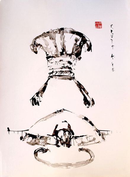 Curator: Here we have Alfred Freddy Krupa’s “Cat,” an ink drawing dating from 2013. The piece feels very immediate, capturing the essence of the animal with incredible economy of line. What do you make of it? Editor: It looks supremely relaxed, almost melting into the creamy background. Those loose, almost scribbled strokes give it such a feeling of gentle, unhurried ease. It's like the cat embodies the pure pleasure of existing, right there in the moment. Curator: Absolutely. There’s an artlessness to it, isn’t there? Yet it reflects a deep understanding of form. We know that Krupa, although rooted in Modernism, worked consciously against the mainstream trends prevalent in the art world. It's as though he wanted to achieve simplicity, reflecting his strong grounding in Japanese ink traditions and Sumi-e, as his grandfather was Japanese. Editor: Right. It’s definitely channelling that East Asian minimalist aesthetic. That bold, confident ink stroke paired with so much empty space—it really distills the subject to its most fundamental character. It’s deceptively simple; you know a lot of thought and control actually goes into achieving that level of ‘casualness’. Curator: It speaks to the idea that, in the public space of art, what is left unsaid, or in this case undrawn, can be as significant as what is explicitly depicted. The blankness makes you focus more intensely on those lines that are present. How the suggestion of a tail is enough, for example. Editor: I agree completely. It suggests an entire world beyond the edges of the paper. That restraint draws the viewer in. It invites a contemplation and an interpretation that more detailed works might sometimes preclude. There's room for your own experience with cats to kind of…complete it. Curator: I think that's very astute. Krupa invites the public into this very intimate and yet, because of the Modernist influences, detached way. We see a cat and understand a feeling of warmth, perhaps even belonging. It's a small, unassuming piece, but the emotional impact is quite considerable. Editor: Yes, like a whisper that resonates long after you hear it. Thanks for giving it some historical depth, Curator. Curator: Thank you, Editor. It's been a pleasure as always.