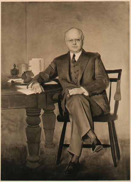 Curator: Before us hangs Charles Sydney Hopkinson's portrait of David Linn Edsall, a man of quiet intellect. Editor: It strikes me as terribly muted, all those grays and browns. Is this a reflection of the sitter, or perhaps something more? Curator: Consider the gold watch chain—a subtle emblem of time, of legacy. Edsall was a professor of medicine, after all. Editor: I see how the composition, though seemingly straightforward, uses light and shadow to sculpt a sense of gravitas. The angle of the arm, the fall of the cloth... Curator: Indeed. The dark background, that hint of crimson, they speak to the weight of tradition and the passing of knowledge. A visual encoding of Harvard's values, wouldn't you say? Editor: Perhaps. Or is it simply the formal language of academic portraiture, rendered with a subdued palette? Still, I appreciate the careful arrangement of forms and textures. Curator: There's a story here, carefully constructed—a man, his profession, and the enduring institution he served. Editor: A fascinating study, regardless of how we interpret the symbolism at play.