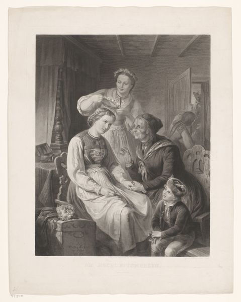 Editor: This is a print titled "English Breakfast", and although we don't have the exact date, it's filed under neoclassicism and attributed to Gérard Vidal. It’s an etching on paper. I'm struck by the stillness in the scene. There’s such intricate detail in the rendering of the fabrics and textures, but it doesn't quite capture warmth to me. How do you see this piece? Curator: Focusing on the formal aspects, the composition is carefully balanced, with a distinct separation of the figures into distinct planes that, along with a subdued tonal range, creates a kind of reserve and balance that you mention. The texture created through etching on the fabric, for instance, invites visual exploration, yet never deviates from the overall cool balance. Observe how the diagonal lines in the drapery in the background echo those of the chair and man's leg to lead your eye into and around the room. Editor: That's interesting, that tonal quality hadn't struck me but the formal balance that draws one in is certainly obvious. Do you feel like that visual coolness restricts any deeper emotion, in a way? Curator: Not restricts so much as, perhaps, redirects. The lines, and shapes form the feeling. Note the contrasting light and dark areas used to define shapes. One must learn to follow their movement like a dance, which then stirs, say, a kind of detached wonder. Editor: I see what you mean. It’s almost like the emotional weight is in the artistry itself. I suppose this more formal reading makes sense given the neoclassical artistic framing here, where rationality is favored over Romantic sensibility. Curator: Exactly. And it makes Vidal an interesting character to focus on within the Neoclassical movement. He highlights a kind of visual balance that defines a kind of detached approach that’s somewhat unique to his aesthetic practice. Editor: So it’s about appreciating the piece for its visual architecture first and foremost. I will keep that in mind in future engagements. Curator: And perhaps question, rather than automatically accept. Critical engagement begins there, certainly.