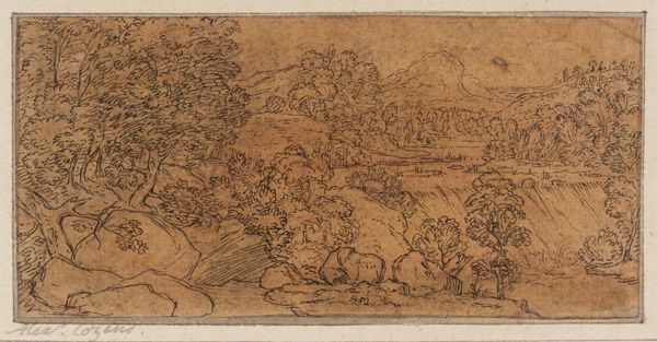 Editor: This is "Shepherds and Sheep before a Rock," a pen and brown ink drawing by Esaias van de Velde. It has such delicate lines, and yet manages to evoke a vast landscape. What catches your eye in terms of the formal qualities? Curator: The composition is certainly striking. Note how the artist uses linear perspective to create depth, drawing the eye from the foreground figures toward the distant town. Editor: Yes, the receding lines in the ground plane are quite effective. Curator: Exactly. And consider the delicate balance between the densely worked areas of the landscape and the open space of the sky. The relationship of line to ground creates a dynamic tension. Did you observe that? Editor: I do now! Thanks for pointing that out. Curator: My pleasure. Paying attention to those formal elements really unlocks the artwork's power.