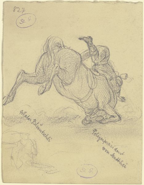 Curator: The frenetic energy captured in Delacroix’s “Arab Horseman at the Gallop” from 1849 is palpable, isn’t it? The pencil and ink work convey such dynamic movement. Editor: Absolutely! The swirling lines create an impression of immediacy, as if he captured this scene in one quick burst of artistic fervor. But to my eye, it’s not just about speed; there's a definite rawness here too, stemming from the very medium used to depict it. The exposed process is a huge part of the piece's affect. Curator: I agree. Consider the historical context: Delacroix's travels to North Africa profoundly impacted his work, influencing not only the subject matter, like the powerful figure of the horseman here, but also contributing to broader shifts in 19th-century Orientalist painting. Editor: And look closely, you can see that those quick pencil lines suggesting flowing garments, kicking limbs, and that furious expression convey something much more about social relationships. A material study can tease out the relationship of the "savage" or the "exotic" as a common Romantic subject and trope with all kinds of embedded colonial notions. Curator: Precisely! The work's reception would certainly have been tied to those established tropes of the time. Were Delacroix, through the artifice of art making and the act of representation, creating something factual and informative, or promoting social stereotypes, even unwittingly? Editor: Yes, those issues remain front and center! This drawing’s rapid execution reminds me that artmaking isn't always a considered process. Sometimes, it's about speed, production, and the conditions of both artist and subject within larger global flows. And consider, as well, who got to participate in such social exchanges as the painter, the sitter, and the collectors and audience who assign value to these crafted items. Curator: A valuable consideration, highlighting the tension between artistic genius and the societal currents that shape it. It seems a relatively small work on paper has opened quite a substantial conversation, wouldn't you say? Editor: Indubitably, the immediacy of its creation can easily lead to deeper exploration of Delacroix's artistic methods and social consciousness during a particularly vibrant and often contested historical period.
