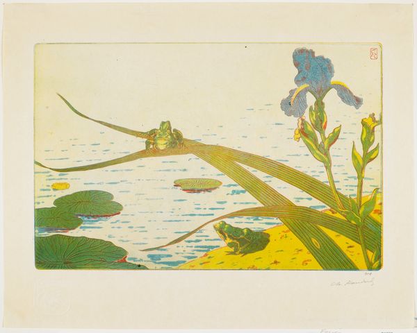 Curator: This is "Fleurs Des Iles Lointaines. Mers De Sud," or "Flowers from Distant Islands, South Seas" by Paul Jacoulet, created in 1940. It's a woodblock print very much in the Ukiyo-e tradition, showcasing Jacoulet's signature style. Editor: The sheer vibrancy of the colors is striking. The vivid blue sea, that sliver of golden horizon... it feels immediately transportive, like a portal to an idealized paradise. Curator: Jacoulet was fascinated by the South Pacific, and this print exemplifies the Orientalist fascination with "exotic" cultures. His prints, while beautiful, also prompt questions about cultural representation and the gaze of the colonizer. How were these islands impacted by resource extraction, and what labor practices were employed in their depiction? Editor: It’s fascinating how Jacoulet blends the traditional Japanese technique of woodblock printing with his own vision of the South Seas. I'm drawn to the detail of each bloom, each petal meticulously carved. Curator: The woodblock process itself is essential. Each color requires a separate block, demanding careful labor and precision. Think about the skill involved in aligning those blocks to create such vibrant overlapping tones. What was the market for these prints during wartime? And what value systems did it sustain or challenge? Editor: Absolutely. There is an interesting tension at play here between the visual harmony and the broader questions of historical context and power dynamics it suggests. The image can make a visitor forget its position within an oppressive, historical view. Curator: These prints were not cheap! Owning one would be a deliberate purchase, and likely a luxury. The subject matter aligns with both colonial fantasies, and, perhaps more innocently, a search for peace and relaxation far from a world on fire. The way that beauty has the ability to distract from its place of origin is very important to consider here. Editor: Examining this artwork requires engaging with layered interpretations, acknowledging both its aesthetic beauty and its complex origins in the social and historical circumstances. Curator: Precisely. Hopefully our reflections offer a fuller, more nuanced appreciation of this piece. Editor: Agreed. A blend of critical thinking with material enjoyment – precisely what we want from these kinds of aesthetic encounters.