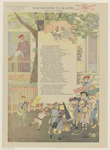 Editor: This artwork, “The Oak and the Reed” by Gustave Fraipont, dated between 1876 and 1890, looks like a watercolor illustration, maybe from a children's book. I’m struck by its segmented composition and the contrast between the large, weathered tree and the figures in the landscape. What do you see in this piece? Curator: The imagery speaks volumes. The oak, a classic symbol of strength and resilience, is juxtaposed with the reed, representing flexibility and adaptability. Fraipont illustrates La Fontaine's fable, delving into power dynamics and the wisdom of yielding. Notice how the storm is rendered. Is it merely a meteorological event, or does it symbolize societal upheaval, a challenge to the established order? Editor: So, the storm isn't just weather, but something bigger, testing the characters? Curator: Precisely. The broken branches of the oak suggest vulnerability despite its size, while the bent reed survives. Consider the emotional weight of the colors: the somber greens and browns, the distressed, toned paper that emphasizes the passage of time. The poem itself, inscribed within the image, serves as an anchor to the story’s moral lesson, reinforcing the symbolic message for viewers. How do those combined elements affect the work's message for you? Editor: I guess the poem’s integration really underlines the moral. I see how Fraipont uses the imagery to make it stick in your mind. The idea that being flexible can be a strength… I wouldn't have gotten that from just looking at the tree and reed separately. Curator: The visual and literary narratives intertwine to offer layers of meaning. Consider the continuity of such parables across cultures, revealing our enduring fascination with archetypes of power, fragility, and survival. Editor: That's a great way to look at it. It shows the power of symbols that carry weight through time. Curator: Indeed. A reminder that art often functions as a mirror reflecting timeless truths through symbolic forms.