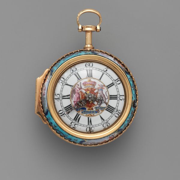 This repeater watch and case was crafted by Thomas Tompion, likely in the late 17th or early 18th century. The watch face presents a delicate interplay of form and color. Roman numerals, rendered in stark black against a pale backdrop, encircle a central image featuring painted figures. The watch hands themselves, ornate and gilded, cut through the visual field, their curves contrasting with the rigid geometry of the numerals. The watch is an object of time-keeping, yes, but also of representation. The semiotic system at play here is rich. The circular face, a symbol of continuous movement, is juxtaposed with the fixed markings of time. The central image introduces a narrative element. Consider how Tompion has challenged the conventional aesthetics of utility. By embedding artistry within a functional object, he invites us to consider time not just as a measure, but as an experience imbued with beauty and narrative. In this context, the watch transcends its function.
