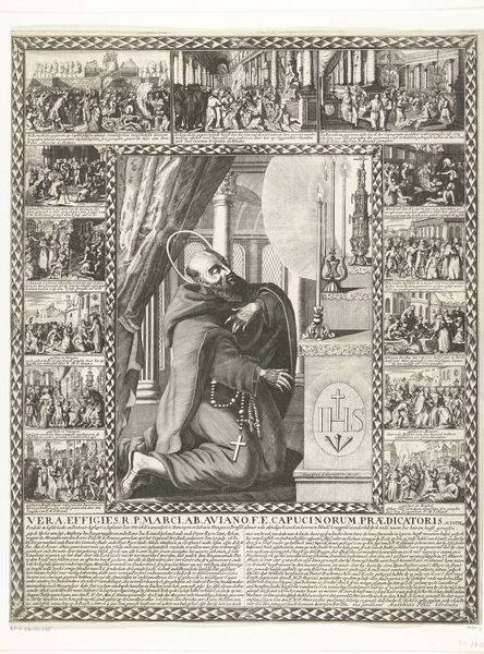 Editor: This engraving by Pieter Tanjé, titled "The twelve-year-old Christ in the Temple," made sometime between 1738 and 1754, captures a scene within what looks like a towering church window. It's currently held at the Rijksmuseum. What I find most compelling is how the figures seem to be frozen in this incredibly ornate setting. How do you interpret this work? Curator: Indeed. It's fascinating how Tanjé captures not just a biblical narrative but embeds it within this powerful symbol of the stained-glass window. These windows, traditionally, weren't just decorative; they were visual tools to communicate religious stories to a largely illiterate public. Editor: So, the window itself functions almost like another layer of the story? Curator: Precisely. Think of the light streaming through coloured glass, illuminating the scene. That light takes on a symbolic dimension – divine knowledge revealed. The image of the young Christ debating the elders, rendered within this window, underscores His wisdom. Look closely at the reactions, the gestures – can you see a power dynamic playing out through their body language? Editor: I do! Some look skeptical, others amazed. And that perspective—with the arches receding—amplifies the drama of the scene. It gives a feeling of immense space. Curator: This spatial depth is key, representing the seemingly limitless scope of theological debate, of knowledge itself. It’s about how we come to find truth within the traditions of faith, and in the act of interpreting stories. This visual echoes cultural memory. Editor: I see now. It's a potent reminder that images carry layers of meaning. Curator: Exactly. The artwork's design prompts you to explore symbols and reflect. A narrative of faith unfolds inside a medium that echoes belief. Editor: It really highlights the idea of stories within stories and how powerfully visuals resonate through time.
