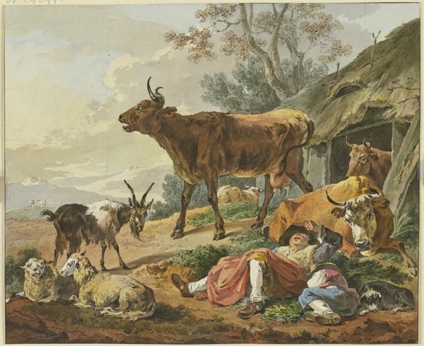Editor: So, this is Robert Hills' "Cows in a Landscape" from the Tate Collections. It's a watercolour piece, quite small. I'm struck by how it captures this very pastoral scene, almost like a snapshot of rural life. What do you see in how Hills presents this imagery? Curator: Well, considering the period, it's fascinating to see how Hills participates in the idealization of rural England. The art market and public perception were increasingly shaped by romantic notions of the countryside. How does this pastoral ideal, present in his composition, serve a social or cultural purpose do you think? Editor: Maybe it was to reinforce a sense of national identity, especially during times of industrial change? Curator: Precisely. This seemingly simple depiction contributes to constructing a narrative about England's identity and values. I wonder how contemporary audiences reacted to these romanticized depictions of farm animals. Editor: That's a great point. I hadn't considered that the painting itself is taking part in shaping a specific view of England. Curator: Exactly. Reflecting on that, we're reminded that art is never created in a vacuum.
