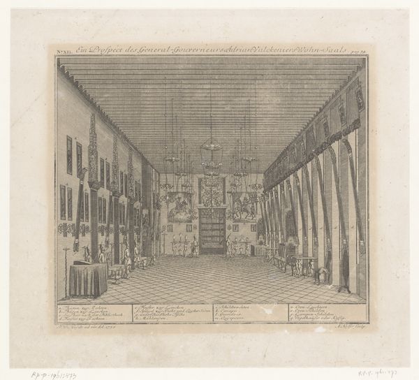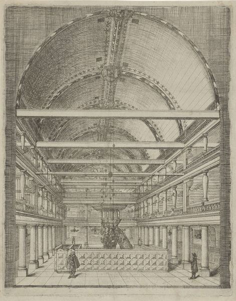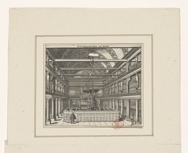 This print, of the Interior of the Old Lutheran Church in Amsterdam, emphasizes the interior’s structural composition through the use of precise lines and calculated perspective. The anonymous artist presents a space where linear elements dominate, creating a sense of depth and order. The lines form a grid, meticulously mapping out the church’s architecture. The repetitive columns and overhead beams articulate a clear organization of space. The use of perspective guides our eye, creating a rational, almost mathematical depiction. Light filters in, casting subtle shadows that highlight the architectural details, adding texture to the otherwise stark lines. The composition of the work is more than just a depiction of space; it is a study in form and structure, reflecting the period's fascination with order, rationality, and the articulation of space. It invites us to consider how physical structures reflect intellectual and cultural frameworks.