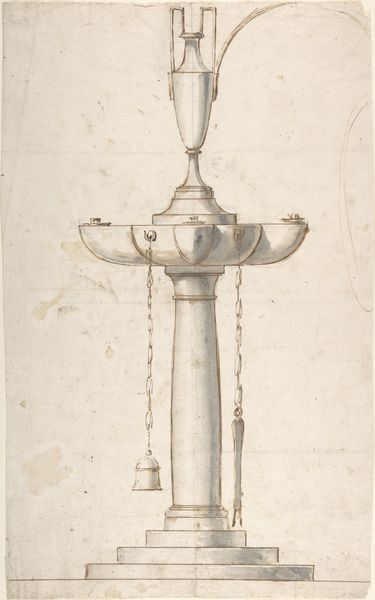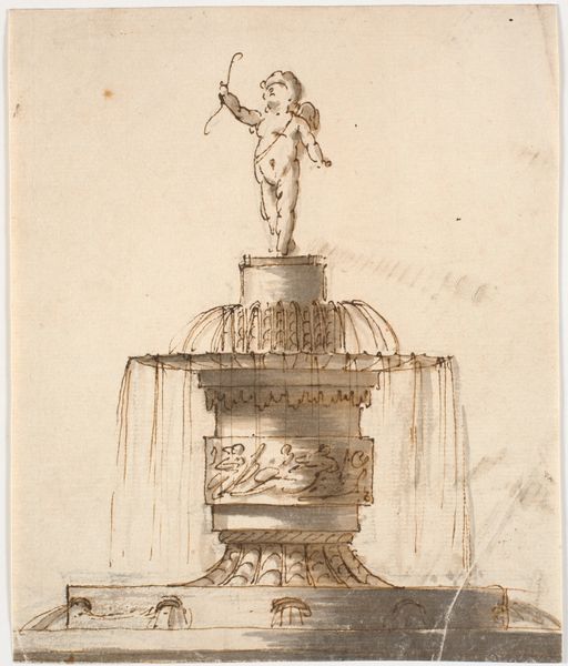 This is an anonymous design for a table fountain, made with pen and brown ink. The drawing presents us with an intricate symmetrical structure, its formal balance immediately striking. The fountain's various tiers, rendered with meticulous detail, rise in measured progression, culminating in a small statuette. The use of line is particularly noteworthy. Each contour is sharply defined, delineating form and texture with precision. The shadows, lightly indicated, give a sense of depth and volume, enhancing the three-dimensionality of the design. The fountain’s geometric clarity, combined with the delicate rendering of its ornamental details, speaks to a broader engagement with architectural and sculptural principles. The linear exactitude suggests that this drawing is not merely a representation but also a kind of proposition. The fountain is presented as an ordered space, contained by line and form, but also a symbol of cultural and aesthetic aspirations.