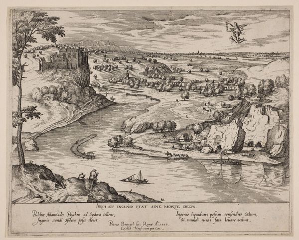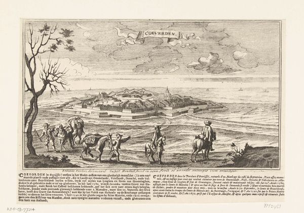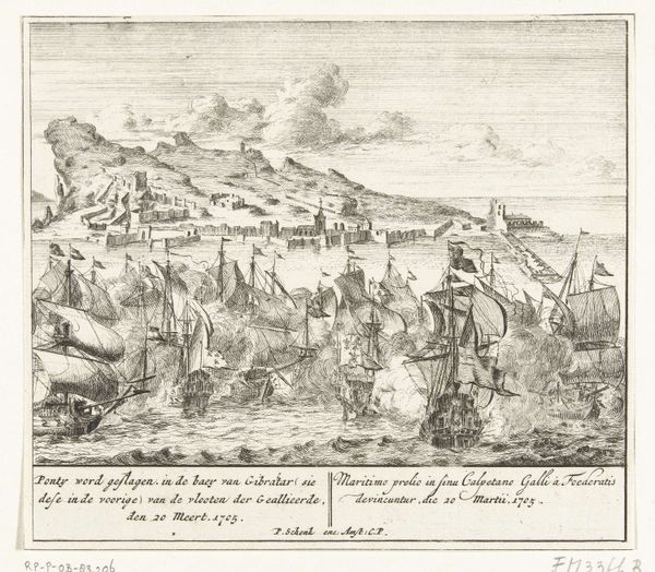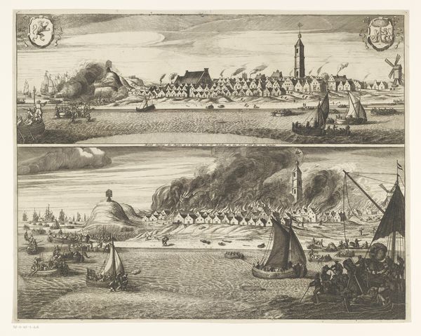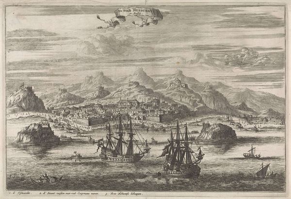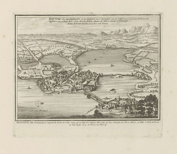 Curator: This is "Gezicht op Schenkenschans" by Gaspar Bouttats, created around 1679. The print, etched and engraved, resides in the Rijksmuseum's collection. Editor: My first impression is the stark, linear quality. The meticulous details almost create a map-like texture, dominated by horizontal lines emphasizing the flat Dutch landscape, punctuated by the vertical masts of the sailing vessels. Curator: Indeed. This bird’s-eye view encapsulates not just the topography of Schenkenschans but also its strategic importance. The fortress played a key role in controlling access along the Rhine, witnessing numerous sieges and shifts in power during the turbulent 17th century. Its repeated capture underscored its vital role in geopolitical struggles. Editor: Absolutely. Consider how Bouttats uses line weight and density to distinguish the key elements—the fortress sharply defined, versus the softer rendering of the distant hills. Note also the use of hatching to create subtle tonal shifts, adding depth. Curator: The inclusion of figures in the foreground, though small, anchors the image and hints at the bustling activity of the port. These elements establish a certain socio-political presence within the constructed landscape, reminding viewers of the community sustained within and around Schenkenschans. Editor: It's fascinating how the print uses graphic language conventions to create depth and simulate light. It calls to mind linear perspective with the scaling down of shapes into the background and aerial perspective, which is mostly limited to light striations simulating cloud cover. The boats create wonderful directional pull that takes your eye toward the distant mountains, implying expansive spatial dimension in limited value ranges. Curator: So, while seemingly just a landscape, the work embodies a moment in time and reflects strategic considerations during a fractious time. Bouttats' etching allows us a window into the 17th-century contest for dominance. Editor: Agreed, that strategic use of light and dark enhances the entire scene, giving the etching more weight in terms of art history. Curator: Precisely. The print not only illustrates a place, but also represents the human efforts to dominate its environs and control its resources. Editor: Seeing how Bouttats rendered form from line gives an important lesson on graphic construction that even contemporary artists could benefit from.