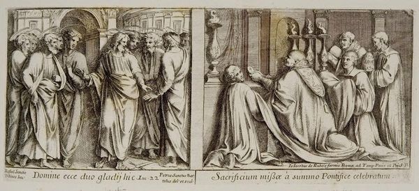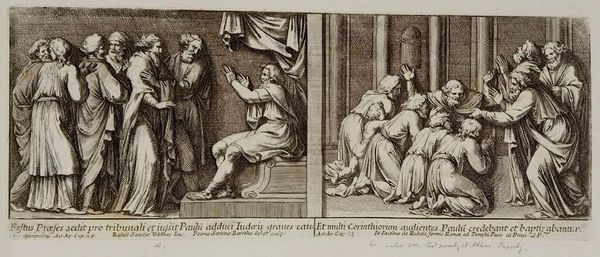 Curator: Pietro Santi Bartoli’s "Saint Paul at Ephesus; Saint Paul Working as a Tentmaker" presents a fascinating diptych. See how the artist contrasts Paul's public debate with his private labor. Editor: Yes, I noticed that division! It's interesting how the artist juxtaposes those two scenes. What kind of statement do you think Bartoli might be making about Saint Paul through this visual comparison? Curator: Note the draped clothing, a common symbol of authority in religious art. Does it serve to legitimize Paul's dual role as a religious figure and common worker, grounding his spiritual authority in practical realities? Editor: That's a neat interpretation; the clothing certainly emphasizes the contrast. I hadn’t considered that interplay. Curator: Indeed. Consider how artists utilize recognizable symbols to convey complex meanings.