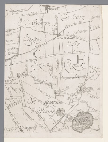 Curator: This delicately rendered map offers a fascinating look at the Hoogheemraadschap of Schieland, including Zevenhuizen and Bleiswijk, dating back to the period of 1611 to 1635. The mapmaker was Floris Balthasarsz van Berckenrode. Editor: The first thing that strikes me is its sense of control, this desire to chart and organize the landscape. There is an underlying assertion of human power. Curator: Absolutely. Notice the meticulous lines and the clear demarcations, carefully laid out using ink on paper. The artist's precision speaks volumes about the values placed on order and clarity. This work functions primarily as a geometrical arrangement with each calculated line precisely meeting at intersection points and angles. Editor: Yet, the elegance of the calligraphy softens the rigid geometry, don't you think? It's as if the mapmaker wanted to make this act of control appear beautiful, to mask power with aesthetic charm. Think about it, the land, especially "polders," represents an intense negotiation with nature. Who benefits, who gets access to that land, how is it distributed? These lines represent real material implications. Curator: I see your point. There is that subtle tension between the imposed structure and the fluidity suggested by the handwritten labels. The overall tonality of the work does, I believe, create a cohesive visual field of expert articulation. Editor: I'm wondering how access to this information shaped societal structures at the time. Was this a tool for landowners, or for broader civic planning? Were decisions made here based on equity, or was there an undercurrent of privilege determining land allocation and distribution? This wasn't merely about geography, but governance. Curator: Well, in my opinion, considering the historical context allows for a richer experience of its formal arrangement. The lines aren’t simply delineations; they delineate power structures as much as landscapes. Editor: Right. Looking at it now, the elegance of the piece also becomes a testament to the intense social negotiation embedded within it. A potent intersection between representation, authority, and control of environmental resources is highlighted. Curator: Ultimately, examining the artistic presentation alongside the historical conditions lets us extract deeper value from the Dutch map. Editor: Exactly! By bringing together aesthetics and the historical frameworks through an intersectional lens, we are able to extract broader critical possibilities of meaning.