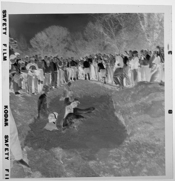 Editor: This is an intriguing photograph, an "Untitled (Lions Club group portrait on grass)" by Hamblin Studio. The reversed tones give it an eerie feel. It makes me wonder, what cultural narratives can you decode from it? Curator: Consider the hats. They aren't merely head coverings; they are badges of belonging, visual cues aligning individuals to shared purpose. How do you perceive the collective identity formed by these symbols? Editor: It speaks of unity and shared values, but perhaps also conformity. A visual representation of social cohesion? Curator: Precisely! The image is a deliberate performance of identity. It also invites reflection on the values and aspirations embedded within such groups. Food for thought, isn't it?