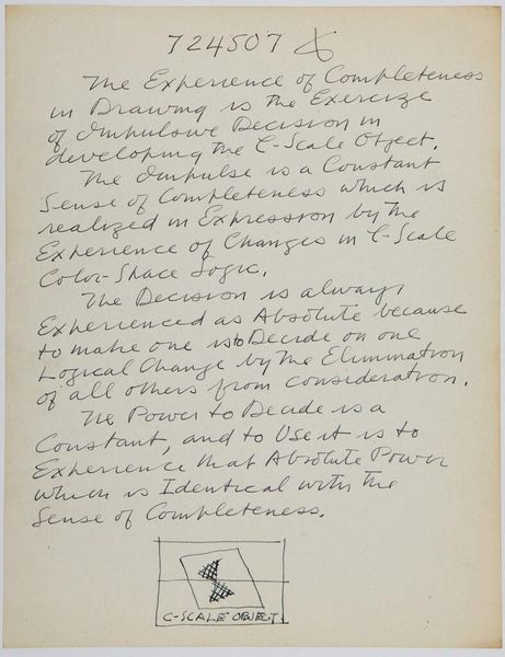 Curator: This piece is a page of handwritten notes entitled "Art Theory Text with Stars and C-Scale Object Diagram" by Stuart Davis. Editor: It looks like a frantic manifesto! All that cramped script gives off a really energetic, almost desperate vibe. Curator: Observe the composition; the lines of text, the numbers, and the geometric shapes create a unique visual rhythm. Davis is exploring his theories, seemingly in real-time. Editor: I see more than just art theory here. I can't help but think about Davis's positionality as a white male artist in the mid-20th century. Who was he writing this for? What power dynamics are at play? Curator: The interplay of text and image embodies a formalist approach. It's about the relationships between these abstract elements on the page. Editor: Perhaps, but I’m drawn to the implied socio-political context and the struggle for artistic legitimacy. Curator: Ultimately, the beauty resides in its raw intellectual energy. Editor: For me, it sparks deeper questions about art's role in reflecting, but also shaping, societal power structures.