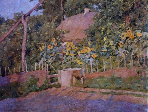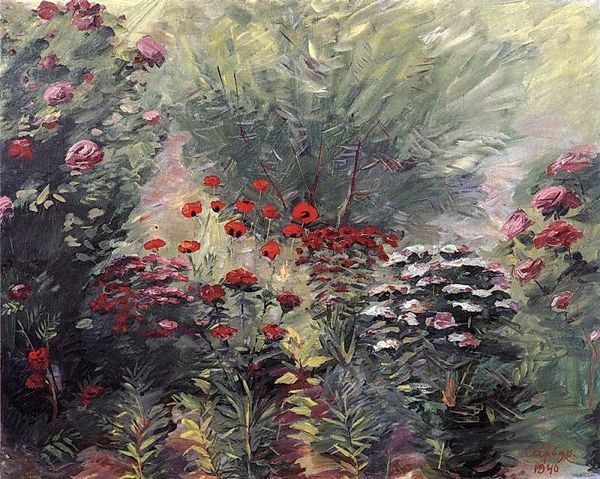 Curator: Let’s consider Martiros Sarian's "Lilac" from 1922, executed in oil paint. What are your initial thoughts? Editor: There's a dreamy, almost tactile quality to it. I’m drawn to how Sarian captured the ephemeral beauty using what appear to be thick layers of paint. It's more about conveying the idea of lilac than precise botanical representation. Curator: Precisely. Note how Sarian abandons academic realism in favor of bold, almost Fauvist color. The structure relies on juxtaposing planes of color rather than traditional perspective, forcing our eye to engage in active interpretation. Editor: I find myself thinking about the physical process. The brushstrokes suggest an urgency, a need to capture the subject before it fades. How would you describe the implications of painting 'en plein air', where Sarian engages the raw materials available to him within nature? Curator: Interesting point. The materiality serves the composition: his simplification and abstraction of form allow for greater emotional resonance. Editor: I wonder, given the political upheavals of the period, how did the physical labor, and the acquisition of materials play into the themes present in this landscape painting. Curator: One could see this as an escape from, or even a commentary on, the turmoil. Consider the intense focus on natural beauty amidst societal change; we can also regard the material reality of procuring paint as an exercise of freedom. Editor: Yes, his manipulation of the material world as a quiet but profound act. Looking closely at how he has constructed it, I’m also reminded that this lilas is a painting first, before it is a representation of natural elements. The material comes first. Curator: Ultimately, Sarian offers a vision of serene beauty divorced from direct narrative. The artwork is not literal—the artist asks for our engagement as collaborators. Editor: It is this engagement with materials and their manipulation which really moves the artwork to another dimension. Curator: Precisely. Thank you for highlighting such points that add another layer to our experience of “Lilas.”