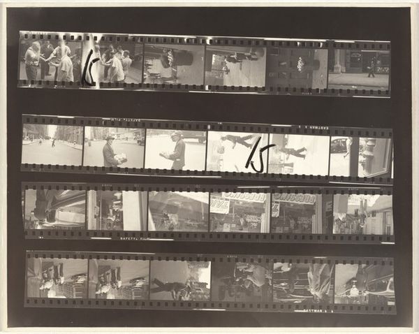 Robert Frank’s “11th Street story 20” is a photo contact sheet, that shows the inherent editing process, and the ways an artist winnows their images to find the best ones. The texture isn’t just in the images but in the film strip itself, and the seriality of the grid, which is a kind of mark making in its own right. This has something in common with Warhol, who embraced a similar mechanical aesthetic, but in Frank's case, it feels more like a form of note-taking, or cataloging experience, than anything as grand as Pop Art. Look at the loop and number “20” scrawled across the first row – a kind of graffiti on the image, evidence of an active, thinking, selecting artist. Frank isn't afraid to show his working, making visible the choices and accidents that contribute to the final piece. It's like a painter leaving the brushstrokes visible, reminding us that art is something made, not just found. This piece resonates with photographers like Garry Winogrand, who documented life with a similar immediacy.