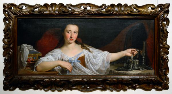 Curator: Here we have a compelling portrait: Giovanni Battista Gaulli's depiction of Giulia Massimo as Cleopatra, rendered in oil paint. It’s a striking example of Baroque portraiture. Editor: Immediately, I'm struck by her gaze. She looks... resigned? Almost as if she's already accepted her fate, but there's still a glimmer of defiance in her eyes. The shadows around her face definitely contribute to that somber mood. Curator: Indeed. Gaulli is deliberately placing Giulia within a complex historical framework. This work prompts us to consider the intersections of power, gender, and representation through the ages, with a potent commentary on femininity in 17th century Europe. Editor: And she’s holding what I assume is the asp? That little bowl looks incredibly delicate against the heaviness of her fur stole and that intense red velvet drape in the background. The staging almost feels theatrical, don't you think? A quiet drama. Curator: It certainly emphasizes the constructed nature of identity and the performative aspect of portraiture, especially how women navigated highly prescribed societal roles. By casting Giulia Massimo as Cleopatra, Gaulli subtly critiques the limitations placed upon women of influence. She is both a powerful queen and a woman confined by destiny, just like Giulia. Editor: It makes you wonder about Giulia Massimo, the sitter. Was she complicit in this narrative, or was it purely Gaulli’s interpretation? What did she think about being painted as Cleopatra? Her expression does suggest a story… Maybe not a happy one, though! Curator: Precisely! And that’s why art history, coupled with insights from feminist theory and sociology, encourages deeper inquiry into the artist’s choices and the socio-political landscape influencing artistic creation, shedding light on female agency within hierarchical constructs. Editor: This piece has this ability to just get your mind racing in so many directions... it’s almost haunting! Now I want to dive deep into all of the old gossip from that time, and see how much of Gaulli’s intent bleeds into the painting itself. Curator: Exactly. The beauty of historical context in understanding a work of art is that it ignites this deeper questioning and expands our awareness, so even through an older lens, the dialogue between us and the artwork continues, regardless of the period or subject.